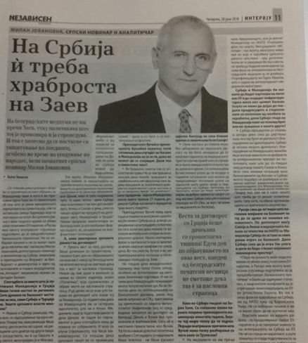 Zašto Srbija nije regovala na sporazum Ciprasa i Zaeva i kako je taj sporazum dočekan u javnosti Srbije. Na ova i druga pitanja LJUPČA POPOVSKOG novinara i kolumniste skopskog dnevnika NEZAVISEN VESNIK, MILAN JOVANOVIĆ predsednik FBD, odgovarao je  22. juna 2016: