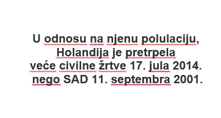 Susret Putina i Trumpa u Finskoj bacio je u medijski zasenak godišnjicu stradanja kada je više od 200 Holandjana poginulo kada je malezijski avion na letu MH17 oboren dok je nadletao istočnu Ukrajinu. Četiri godine kasnije rodbina stradalih i daljle bori se sa ruskim dezinformacijama i vlastitim emocijama. Tekst o tome objavila je novinarka ANNA HOLLIGAN na nezavisnom internacionalnom novinarskom portalu CODASTORY 16. jula 2018. pod originalnim naslovom 'Bitka Holandije sa njenim 11. septembrom'.