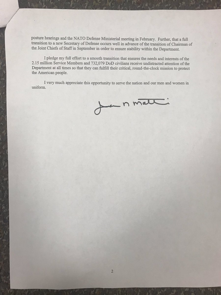 Zbog toga što imate pravo da imate Sekretara odbrane čija su shvatanja u boljem skladu sa vašim po pitanju ovih i drugih tema, verujem da je odluka da se povučem sa svoje funkcije ispravna. Poslednji dan mog mandata će biti 28. februar 2019. god. što bi trebalo da vam pruži dovoljno vremena za imenovanje i potvrđivanje moje zamene i da omogući da se interesi ministarstva u KOngresu ispravno artikulišu i štite, prilikom postupka za imenovanje kao i na sastanku ministara odbrane zemalja članica NATO-a u februaru i, najzad, da će se imenovanje novog ministra odbrane dogoditi pre zamene načelnika Generalštaba u septembru kako bi se obezbedila stabilnost unutar ministarstva.