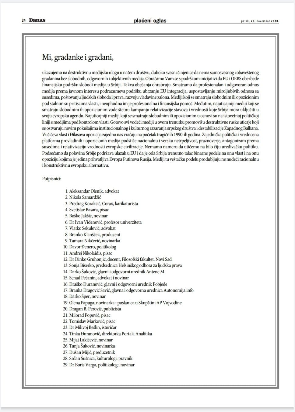 Prošlo je više od dve nedelje kako je u beogradskom dnevniku ’’Danas’’ objavljen oglas dvadeset i devetoro građana sa nespornim ugledom u kulturno-političkom miljeu u trouglu Beograd-Podgorica- Zagreb u kome su oni, obraćajući se EU (ali i čitaocima oglasa) izložili svoje viđenje, ako se to tako može sažeti, medijsko-političkih (ili obrnuto) prilika u Srbiji.