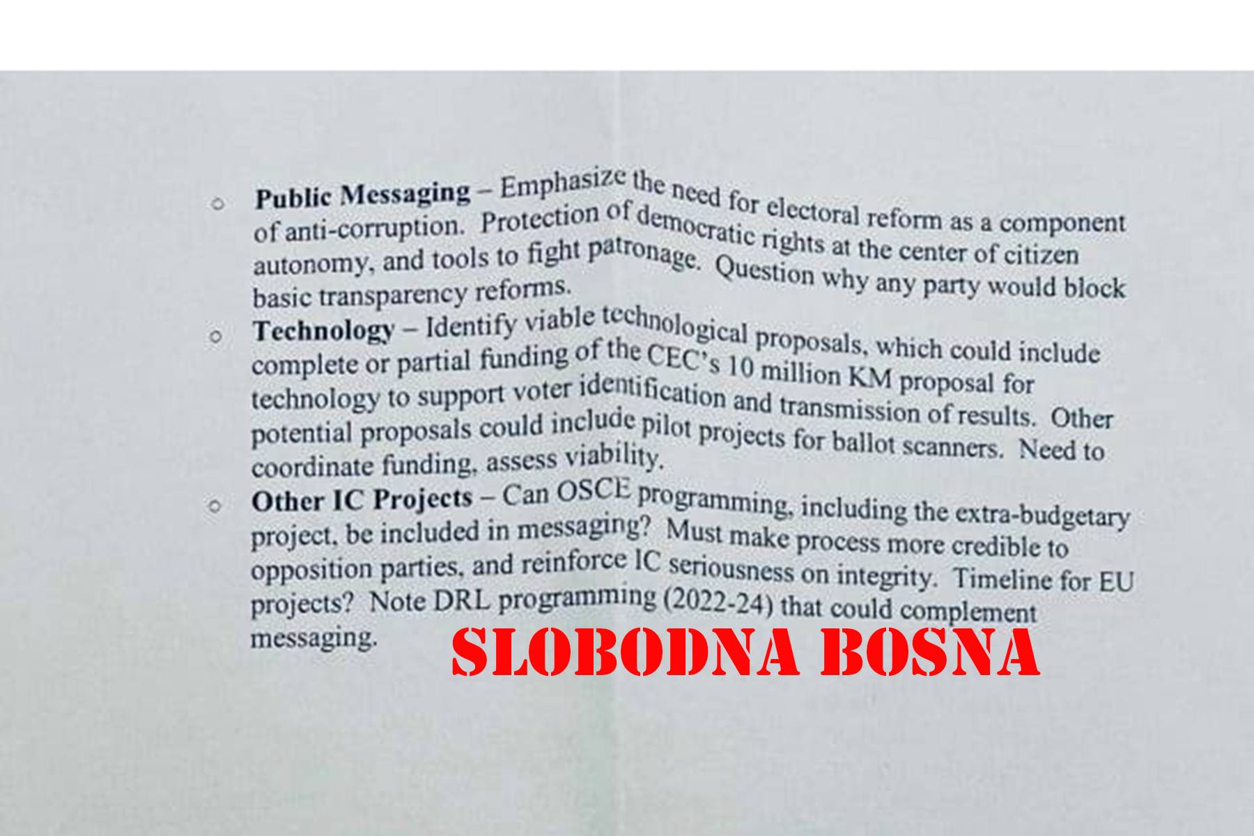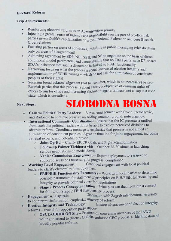 “Slobodna Bosna” je 26. oktobra 2021. na svom portalu u ve;ern jim satima objavila teks koji je napisao SAMIR BEGOVIĆ o non-paperu iz diplomatskih koji je, prema informacijama ovo lista , Matthew Palmer ranije prezentirao predstavnicima nekoliko ambasada u BiH, a koji sadrži načela i korake kojima se vodi pri posredovanju u sprovedjenju reforme Izbornog zakona u Bosni i Hercegovini