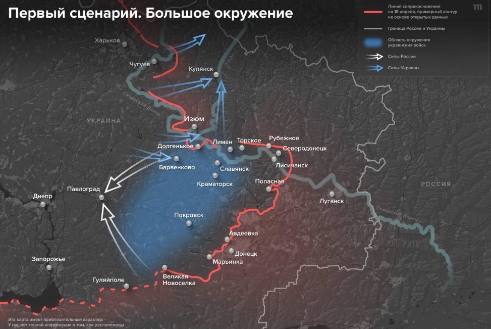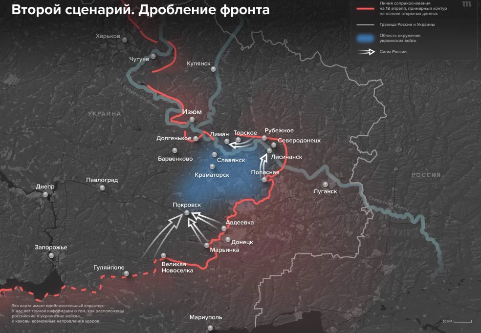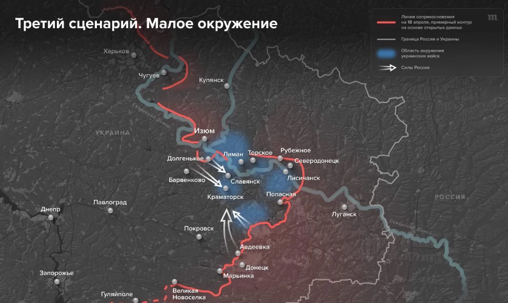 Ruski opozicioni portal MEDUZA 21.04. 2022. objavio je ovaj tekst u kom se spekulisao o tri scenarija i sa tri provizorne mape i šta bi se moglo dešavati u nastavku.