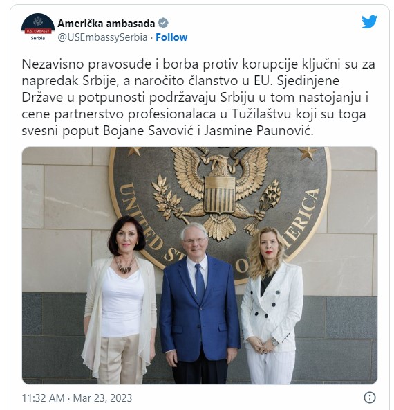 Nakon kratkog zatišja u aferi premeštaja tužiteljki Savović i Paunović dočekali smo novi obrt. Njihov nedavni razgovor sa američkim ambasadorom Kristoferom Hilom i objava Američke ambasade na Twitter-u koja je nakon toga usledila podstakala je i inspirisala saveznike višeg javnog tužioca g. Stefanovića na direktnu akciju.